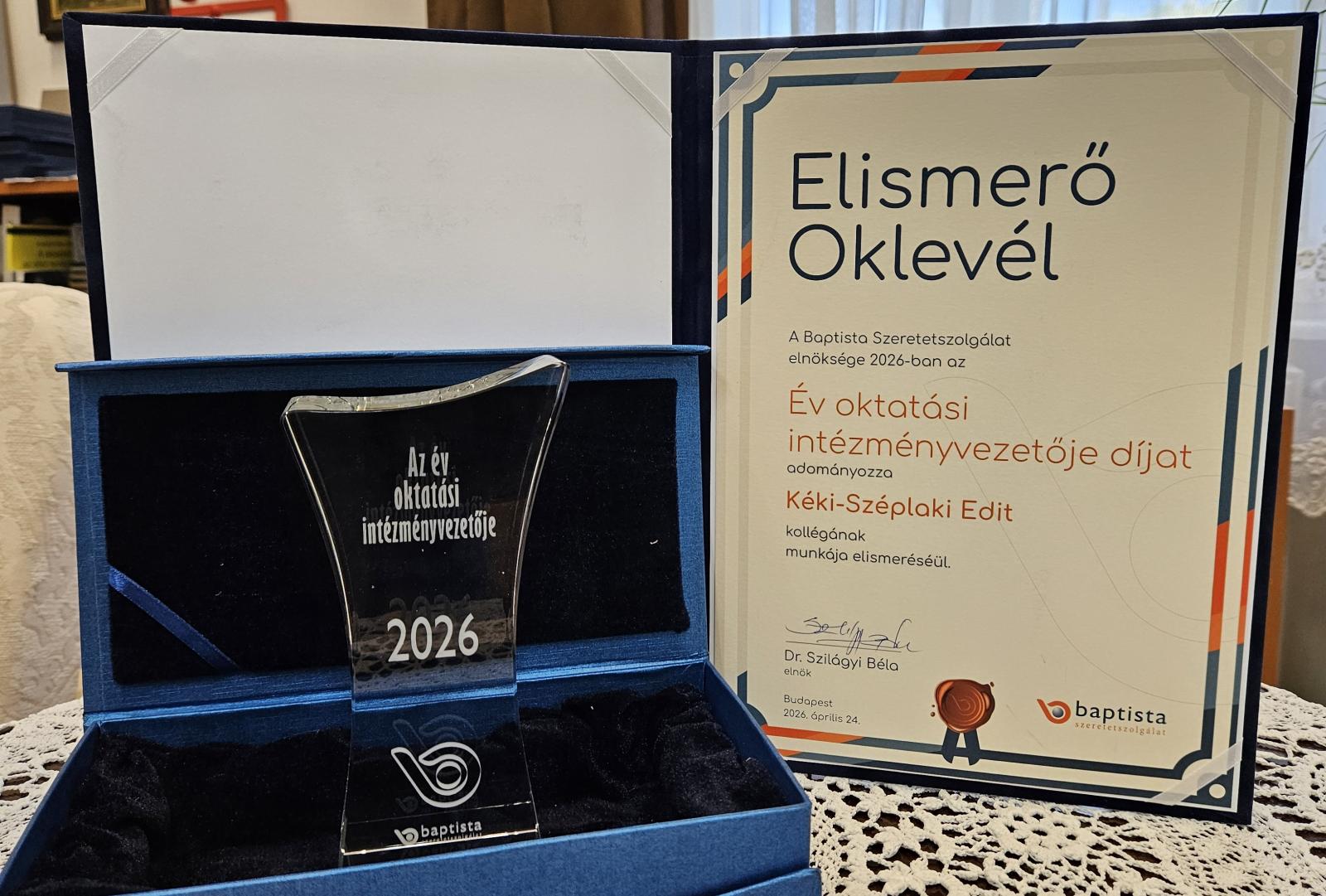 A Baptista Szeretetszolgálat elnöksége 2026-ban az „Év oktatási intézményvezetője díj”-at adományozta Kéki-Széplaki Edit igazgatónőnek.